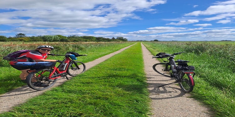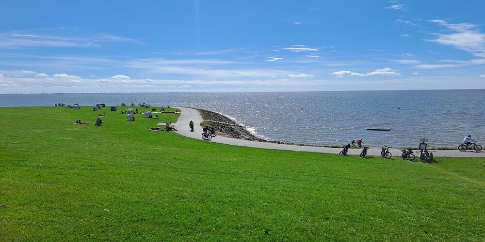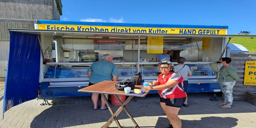 Mol oppen Deich kieken (grammatikalisch bestimmt falsch) aber es zieht uns zu den Friesen. Ein Familiengrillen in meiner alten Heimat nutzen wir für eine kurze Auszeit und den Sprung nach Nordfriesland. Wegen der noch herrschenden Urlaubszeit bekommen wir auf dem "SPO Camping" bei Sankt-Peter-Ording jedoch nur für 4 Nächte einen Stellplatz. Bei allerbestem Wetter genug Zeit um die Gemarkung Eiderstedt mit den Rädern zu erkunden. Das sehr schön gestaltete Glückscafe in Vollerwiek fanden wir zufällig. Der Rummel um die besten Strandplätze auf dem weitläufigen Dünengelände in S.P.O ist uns aber bald zu viel.